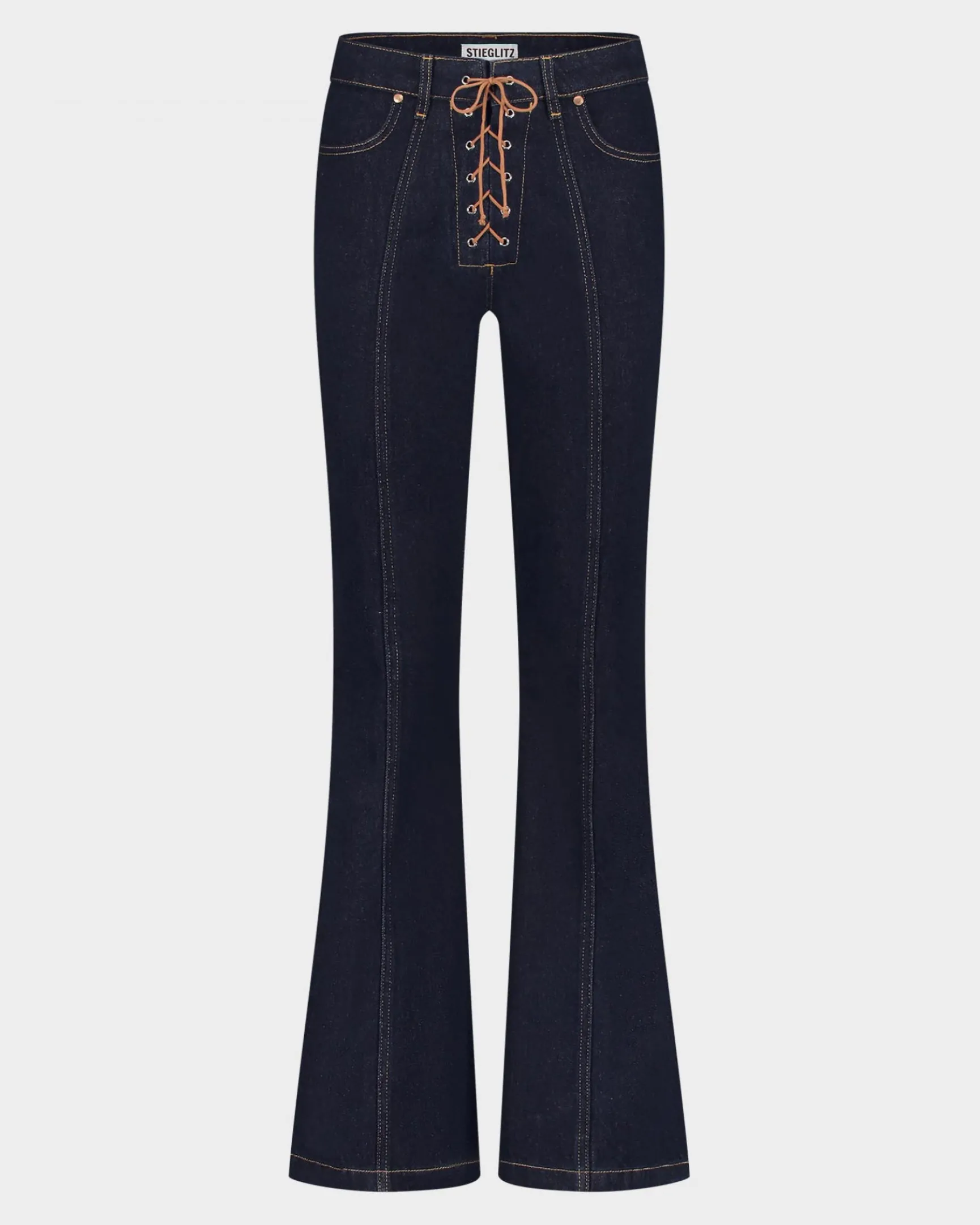 De Dara Flared Jeans hebben een flared pasvorm met opvallende vetersluiting met een vrouwelijk silhouet. Perfect voor wie een statement wil maken met denim.