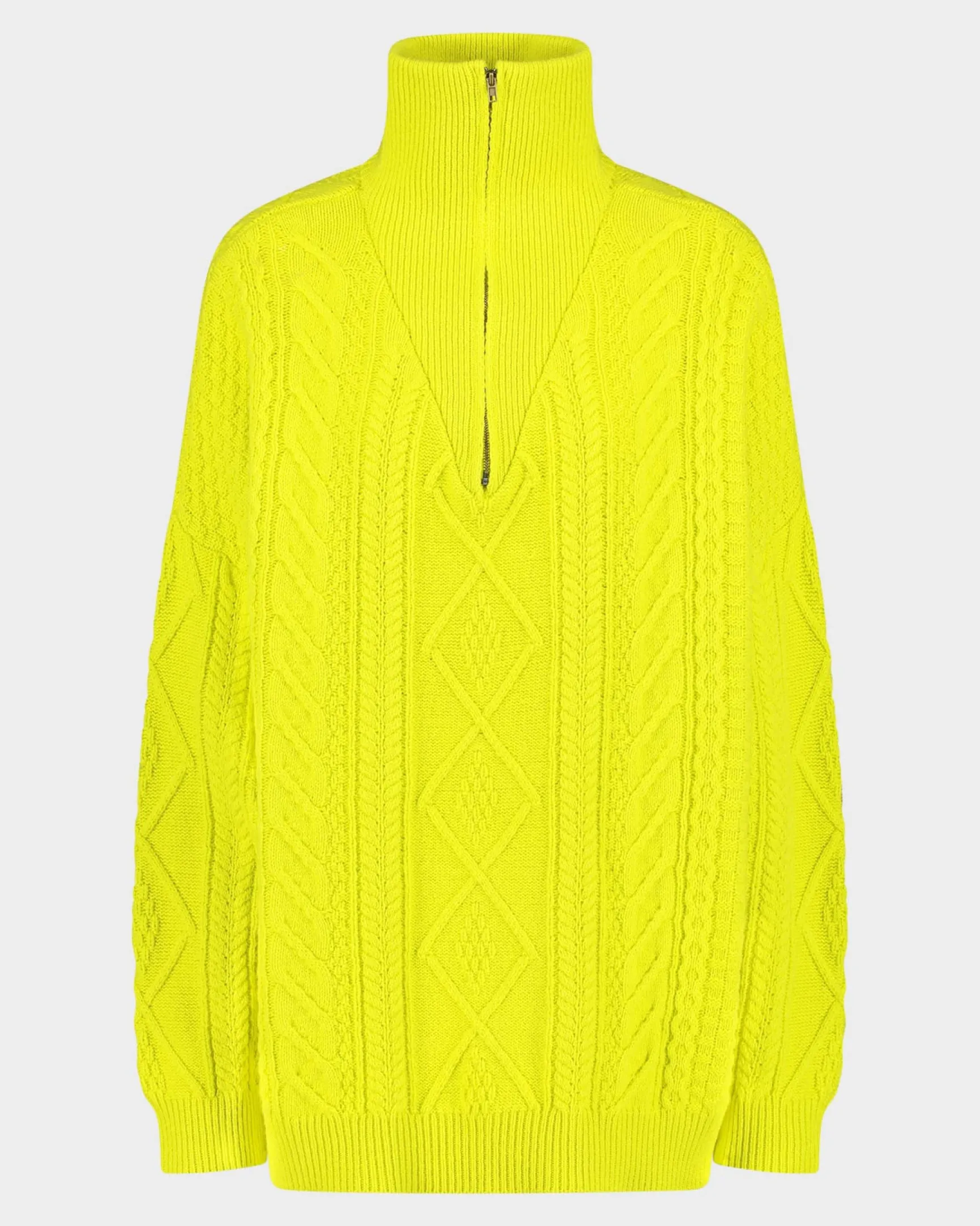De Larena Jumper valt op door zijn felgele kleur en comfortabele gebreide ontwerp. Met een hoge hals met rits en een losse pasvorm is deze trui perfect om warm en modieus te blijven.