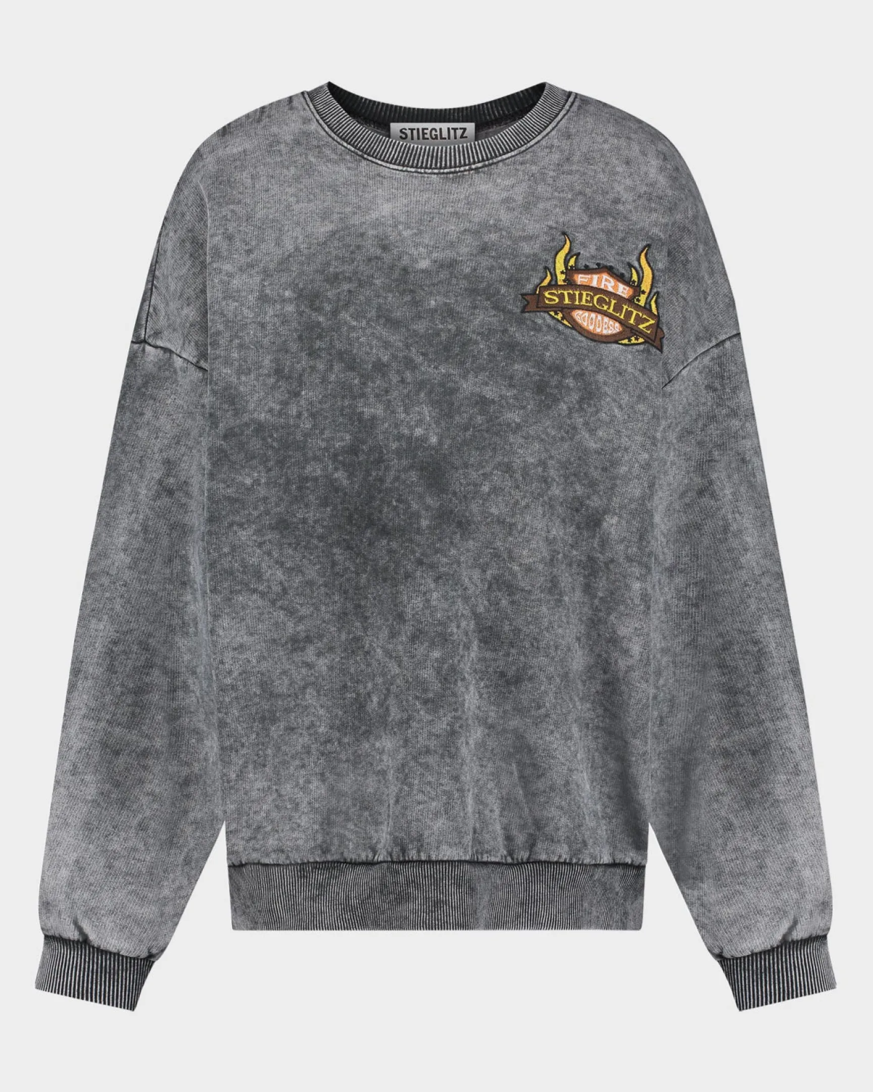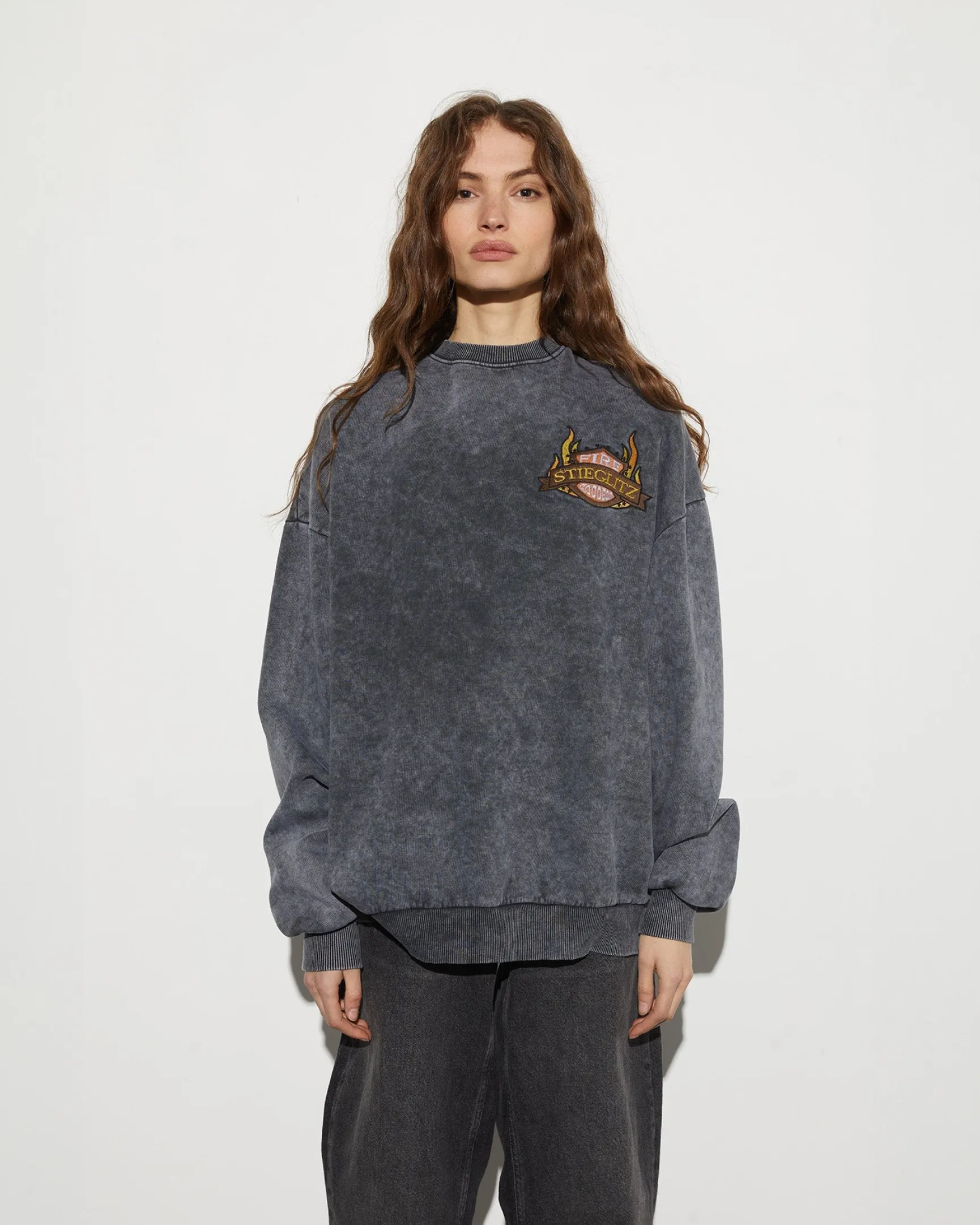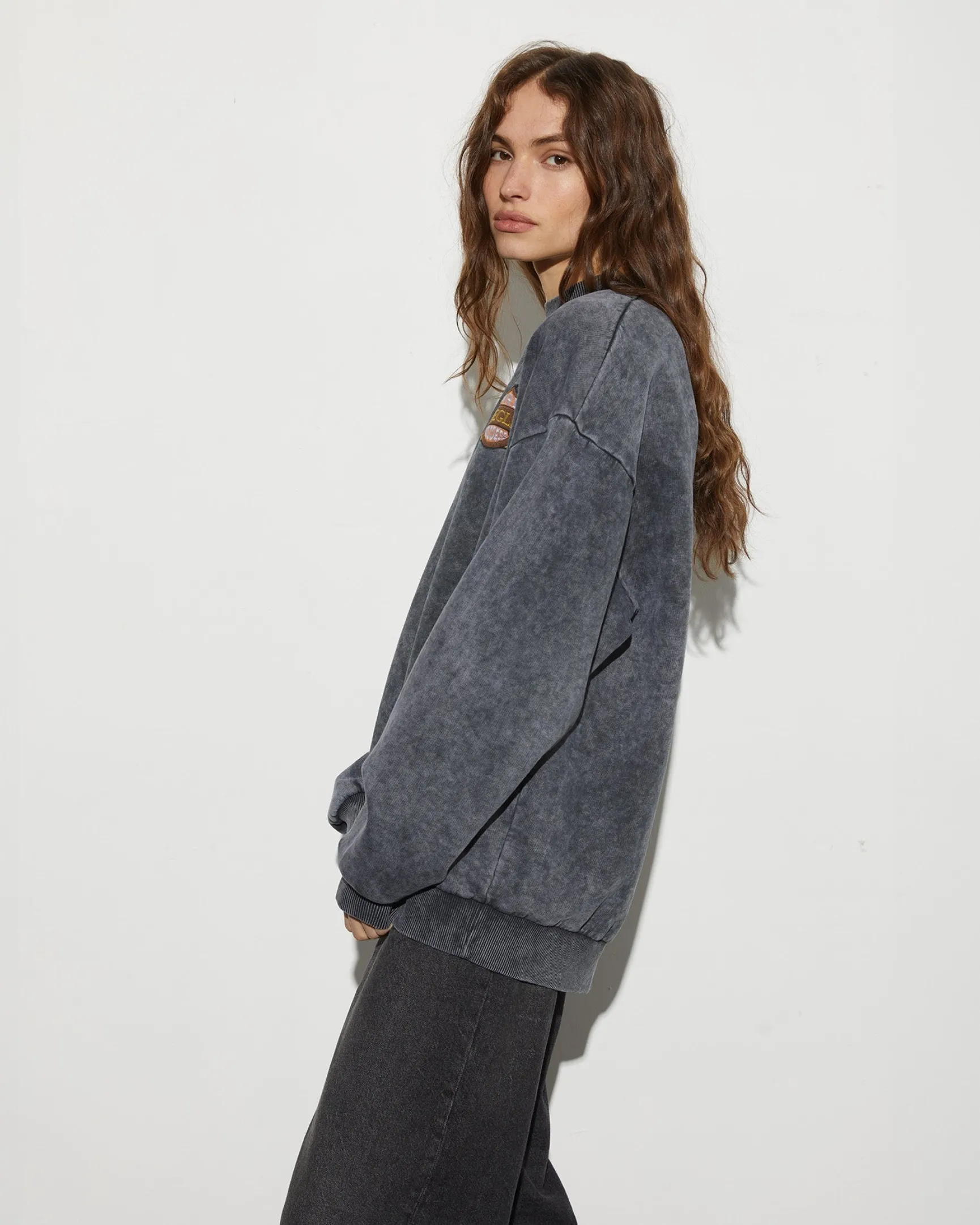 De Nina Sweater heeft een oversized pasvorm en een gewassen look, afgewerkt met een stoere patch voor extra karakter. Comfy en cool.